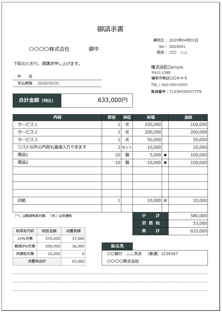 適格請求書発行事業者の登録番号、税率、消費税額なども記載対応済み。