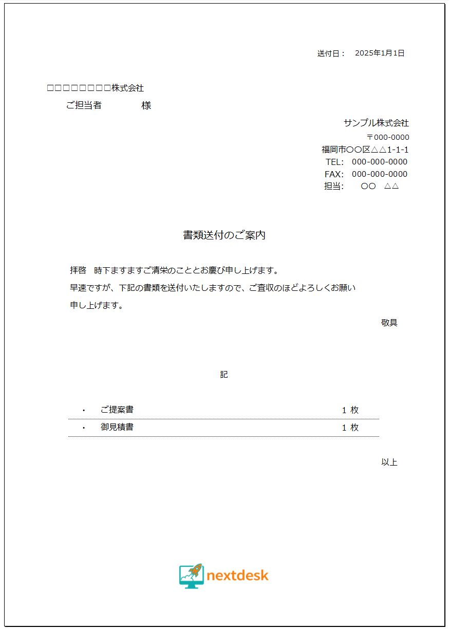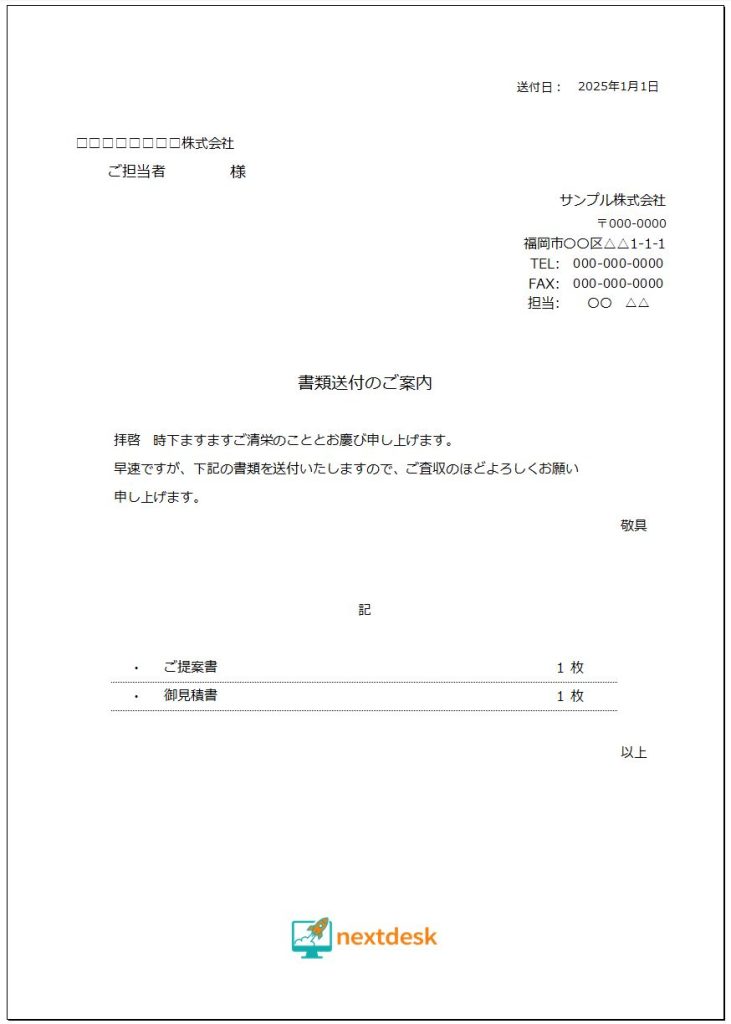 機能は書類送付状(シンプル)と同じExcelのテンプレートです。